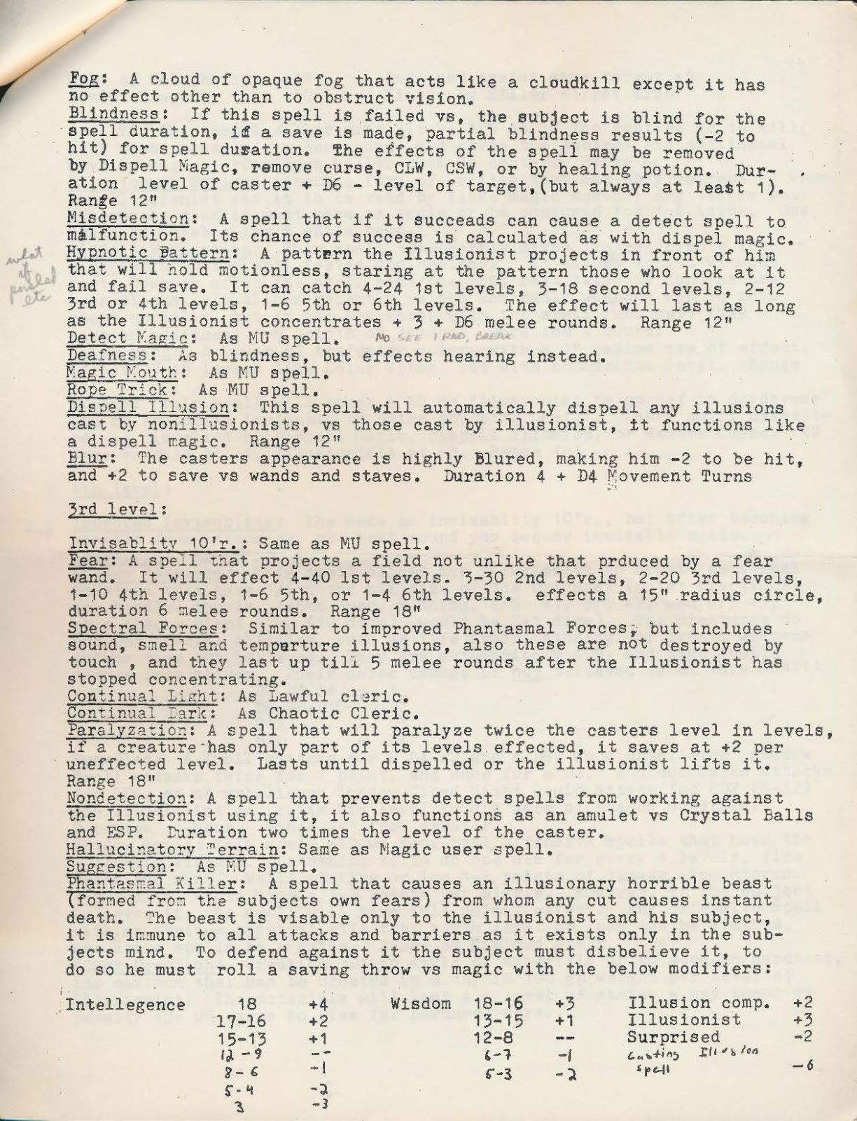 The following year, Aronson felt he needed to revisit the Illusionist. An article he submitted to Wild Hunt #19 gives the rationale for most of the changes in this 1977 version of the Illusionist class. Aronson notes that because he had originally designed the class before Greyhawk, it was burdened with number of inconsistencies with the evolving D&D system that needed to be addressed.